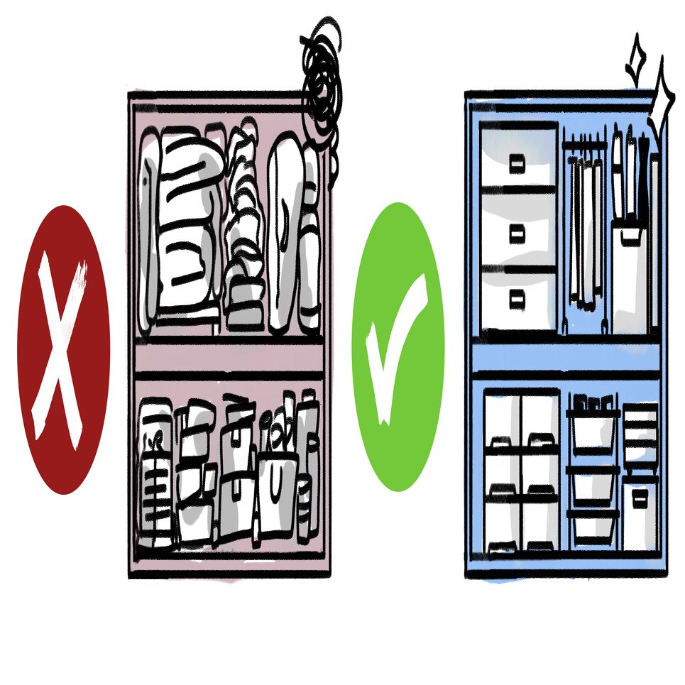 ただし、収納スペースに全て収まらない場合は、使用頻度の高いものから配置し、低いものは付近の収納へ入れてみましょう。