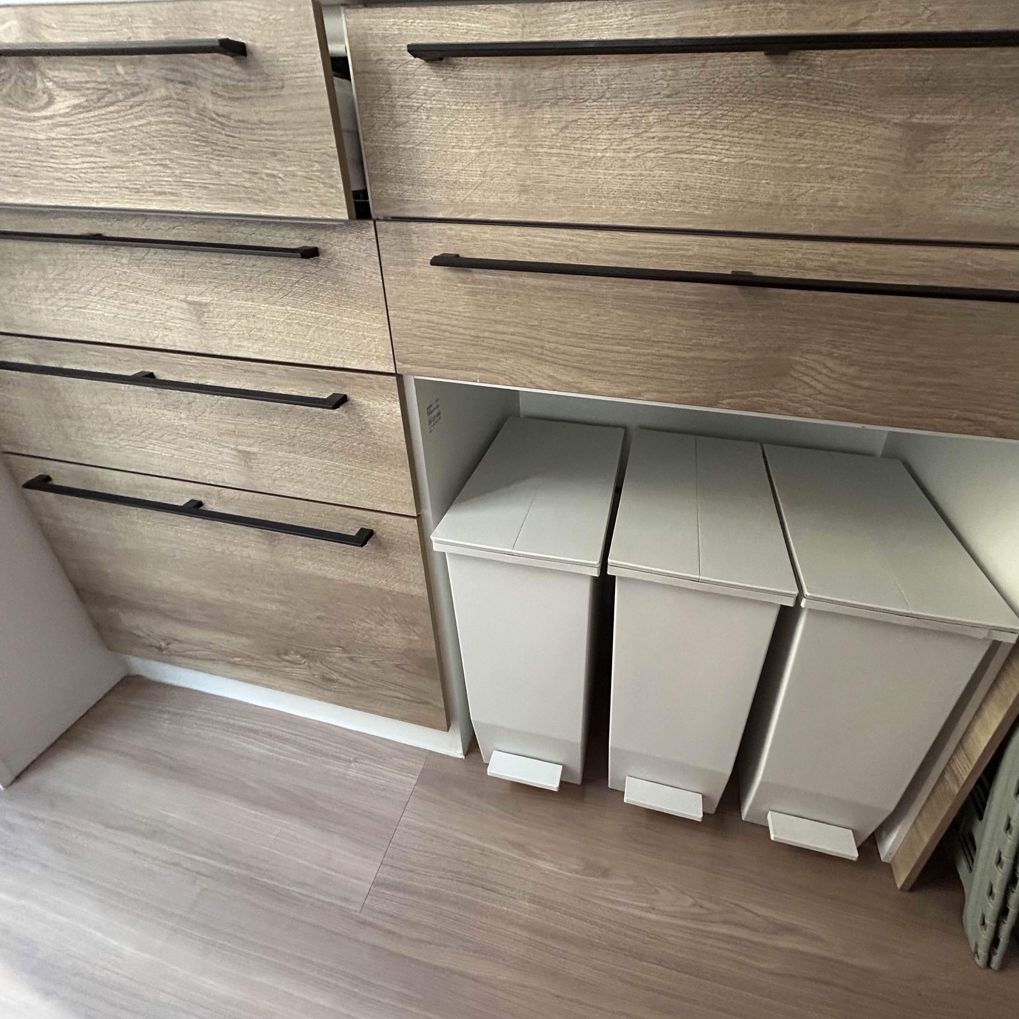 筆者はカップボード下に可燃・プラ容器・紙容器など量のあるもの、パントリーには、分別が必要なビン缶・資源ゴミを保管しています。パントリーは、引き出しを使用し、見た目もスッキリです。