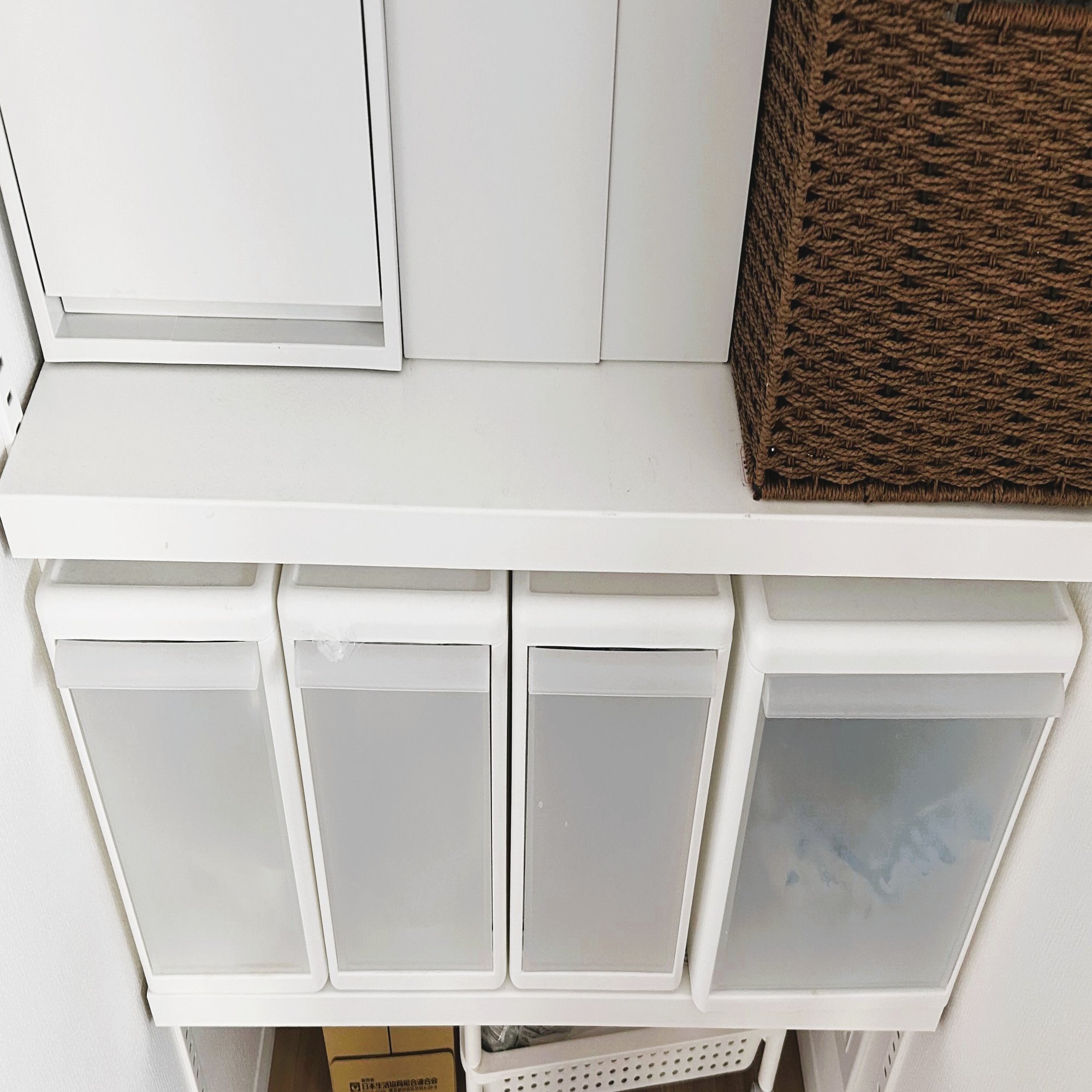洗濯機の上に吊戸棚やオープン棚を設置すれば、洗剤やハンガーなどを置くスペースとして有効活用できます。 - ニッチや隙間収納