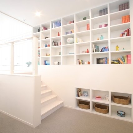 奥行きの浅い壁面収納を設ければ、本棚や飾り棚として活用できます。扉をつければ、掃除道具や日用品のストックなどを隠して収納することも可能です。また、覚えておく必要があるDMや学校関係のプリントを壁面収納に保管しておくのも良いです。